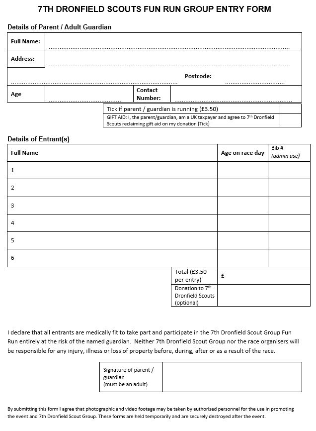 We do not take advance entry to the fun run. Please enter on the day by registering at the Scout Hut on Gorsey Brigg. Price £3.50.